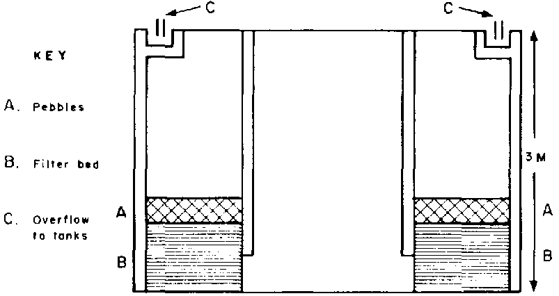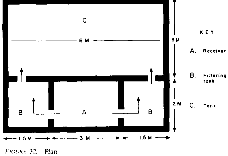 An improved system of water purification is illustrated in Figures 32 and 33. River water enters one of the two cement cisterns communicating at the base. The water in the second tank rises slowly through a bed of filtering material - for instance, some sprigs covered with a layer of pebbles. A very efficient filtering bed is obtained from a material available in most tropical regions - the fibre from the leaf-sheath of the sugar palm (Arenga saccharifera), in Java called injuk or indjuk. On account of its peculiar texture this material is not easily clogged and retains most suspended matter. However, in filtering, ordinary sand may serve equally well.