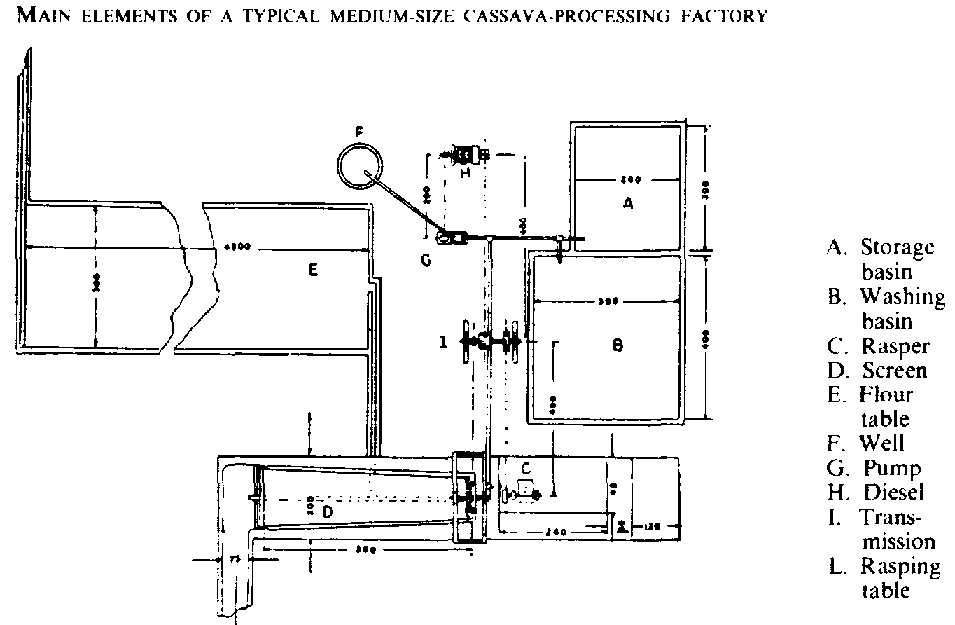 Cassava processing can perhaps best be outlined in the form of the layouts of or other data on existing factories belonging to each of the three production levels (small, medium, and large) which have been taken as a basis for classification.