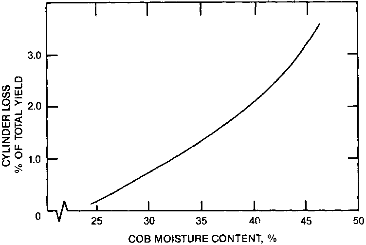 Goss et al8, report similar data on cylinder loss versus moisture content. These data are presented in Fig.9 (see Fig. 9 Cylinder loss and its relation to kernel moisture content. Self-propelled unit-cylinder-concave clearances were 314 to 1-inch at front, 5/8 to 314-inch rear; cylinder speed was 2760 to 2905 fpm; feed-rate not including corn, was 190 to 370 lb per minute. Combine with snapping roll-clearances were 1 114-inch at front and 9/16-inch at rear; cylinder speed was 2750 to 2865 fpm; feed-rate, not including corn, was 37 to 85 lb per minute.) show that a difference in loss level exists. Important is that cylinder loss tends to increase with kernel moisture but with careful adjustment this loss can be maintained below 1%.
