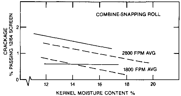 Damage from a rasp-bar cylinder increases with peripheral speed, especially at speed above 15.2 m/s. 11.12 Laboratory studies have indicated that damage is considerably less when the ears are fed into the cylinder with their axes parallel to the cylinder axis, rather than longitudinally or In random orientation.13 Kernel moisture content has a significant effect on damage from either a combine cylinder or a cage-type sheller. Results from various studies 13,44 indicate that crackage increases as the moisture content is changed in either direction from a minimum crackage zone of about 20 to 22% (Fig. 14 Effect of kernel moisture content upon grain crackage from two types of shelling units, as determined with a 4.8-mm (12164-in.) screen.).