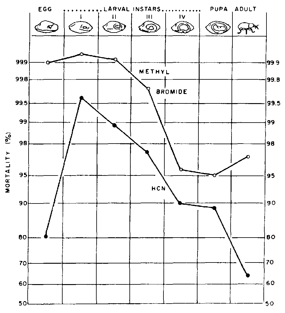 Apart from the influence of the environment, there is a great variation in susceptibility of different species of insects to different fumigants. The successive stages of a given species may also vary greatly in response. Figure 7 illustrates this point. The data were obtained during an extensive study of the usefulness of HCN and methyl bromide for the disinfestation of empty ships (Monro et al, 1952).