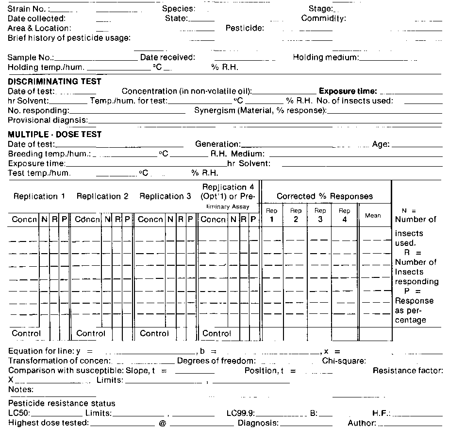 If there are no survivors, the sample can be classified "no resistance detectable" and the medium in which the test insects were held placed in a hot air oven to destroy the culture. If survivors are recorded beyond the exoposure period, comparisons must be made of the responses to a graded of doses, of the suspect strain and a known susceptible strain using laboratory standardised material. This is done either at the laboratory carrying out preliminary tests or at a central laboratory. Additionally if a low proportion only of insects survive the discriminating dose, the insects not knocked down are removed immediately from the test filter papers and placed in media to breed. Their progeny are tested at the discriminating concentration. If the surviving insects represent the upper range of normal susceptibilitty, all progeny can be expected to respond at the discriminating dose. If, however, they represent true resistant phenotypes, a lower proportion of the progeny will be knocked down than responded in the original sample. This test provides valuable confirmation of resistance in doubtful cases.