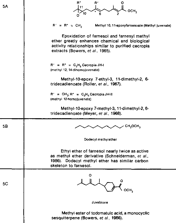 Attempts to obtain active juvenile hormone by extraction of Corpora allata failed, until an unpurified extract was obtained from the abdomens of the adult males of Hyalaphora cecropia (= Platysamia cecropia), a Saturnid silkmoth (Williams, 1956). Purified extracts were not isolated until 1967 by Roller et a/. and by Meyer et al. in 1968. which differed only slightly from the farnesol derivative obtained by Bowers et al. (1965) (Fig. 5A).