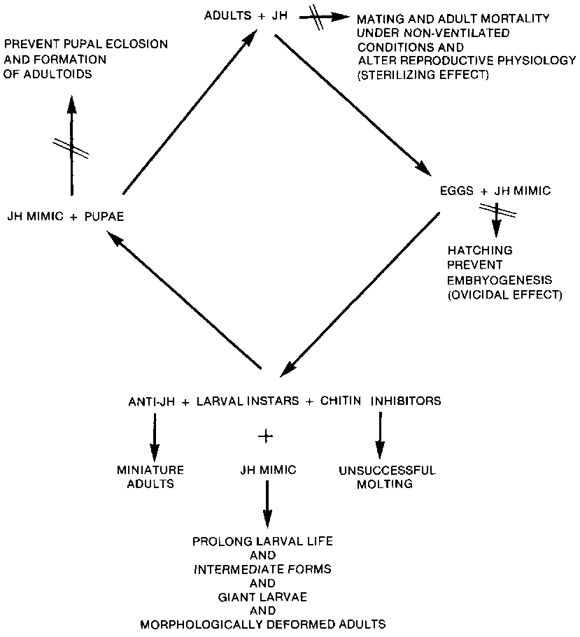Fig. 6. Diagrammatic scheme of insect growth regulator actions during the insect life cycle.