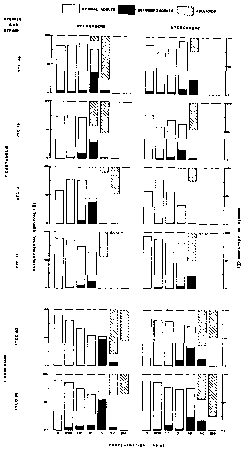 If treated larvae do complete development they may give rise to morphologically deformed adults (Amos and Williams, 1974). They recognized a range of adult deformities with Tribolium castaneum Herbst including aberrations of the tars), legs reduced to unchitinized stump-like appendages, lack of differentiation and poorly chitinized antennae clubs, to crumpled and greatly diverging wings and elytra and developmental intermediates or "adultoids" (pupal-adult mosaics). Some IGR's increased developmental mortality while others inhibited complete development of adults depending on applied concentration.