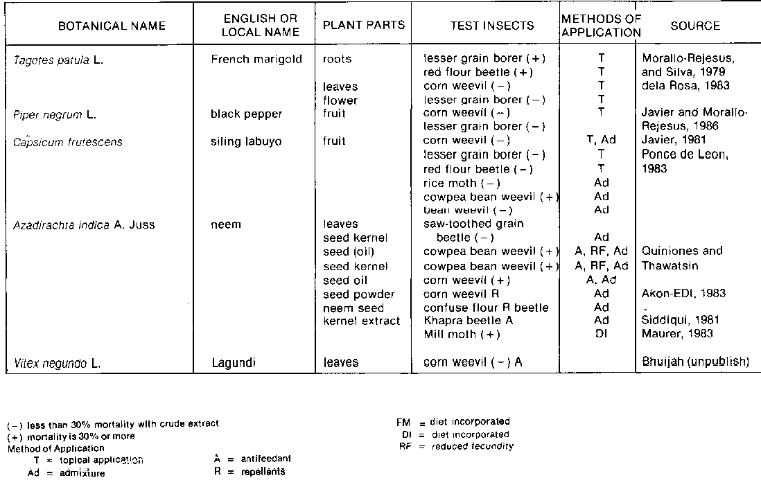 Studies of the characterization and identification of active insecticidal principles of the other plants listed in Table 1 are being continued at the University of the Philippines at Los Banos.