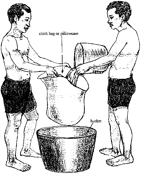 FILTERING: pass material slowly through a device which permits fluid to pass through but retains solid particles. Equipment used: fine piece of muslin cloth or pillowcases. The fabric used should be fine enough to allow the liquid to pass through but retain the coarser material or pulp.