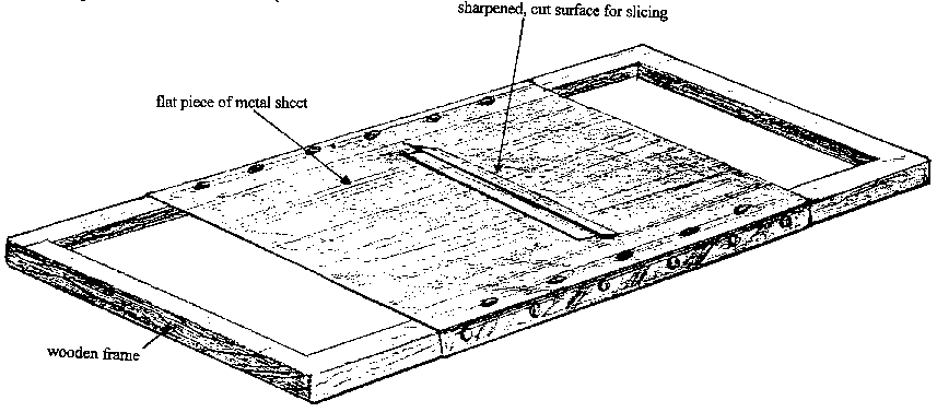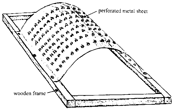 The wooden framed, manually operated, general purpose grater illustrated below is made from wood and galvanised sheet steel. The frame is made of 2.5 cm square cut pieces of wood. The perforated surface is made from a curved piece of galvanised sheet steel which is screwed onto the wooden frame. Ideally the sheet of steel should be screwed onto the wooden frame using brass screws to avoid rusting. The holes in the steel are made by punching the surface with a strong 2 - 3 inch nail. The holes should be made by punching the nail though from the underside of the piece of metal. This ensures that the rough edges, against which the vegetable is to be rubbed, are on the outside surface. These graters can be made in any size required. They should however be thoroughly dried after cleaning to stop them rusting.