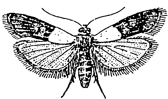 E. kuehniella (envergure 15 à 25 mm, surtout dans les pays à climat tempéré)