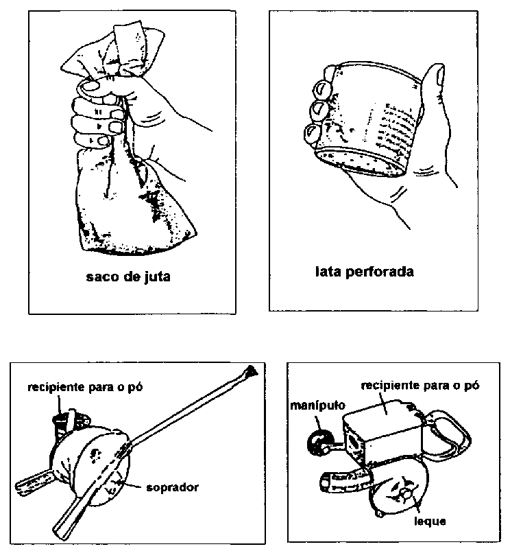As formulações em pó são aplicadas por meio de recipientes para polvilhar. Existem diferentes modelos, todos económicos, simples e eficiêntes que podem ser comprados facilmente nos mercados locais: