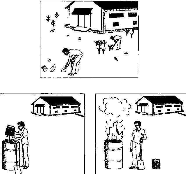 - Junte o lixo num recipiente (p.ex. antigo tambor de óleo)! Queime o lixo combustivel imediatamente e enterre o material não combustível!