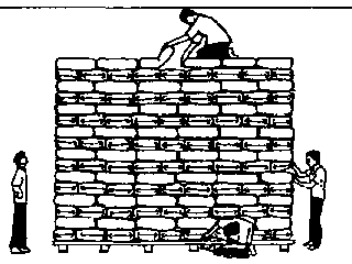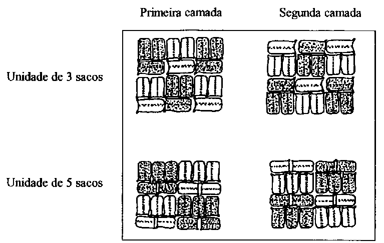 A finalidade de um empilhamento de sacos é a de construir pilhas estáveis que não possam desmoronar-se. Na pratica, é conveniente dispor os sacos emunidades de três ou de cinco, dependendo dos seus tamanhos, sendo essencial a sobreposição dos sacos em diferentes camadas.