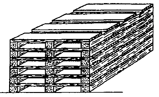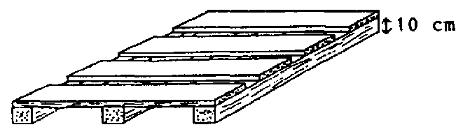 As paletas deveriam ter uma altura de 10 cm para possibilitar um arejamento suficiente. Além disso, pode-se detectar assim mais facilmente uma possível infestação com roedores. A ilustração seguinte mostra um modelo com três travessas de base e tábuas para a parte superior de uma espessura de pelo menos 2.5 cm.