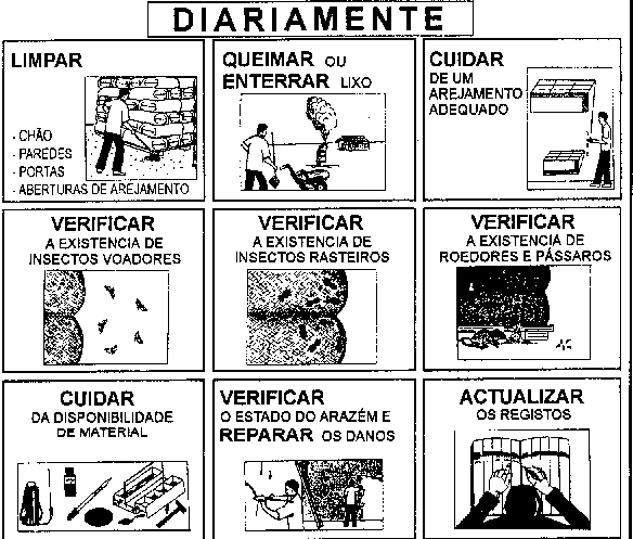 - Verifique que qualquer dano no armazém seja reparado (tecto: fugas; paredes e soalho: fissuras; portas: defeitos de hermeticidade; aberturas de arejamento: gazas e grades danificadas, vidros quebrados)!