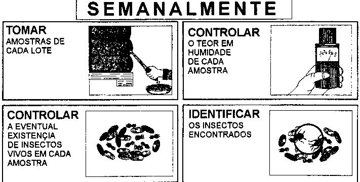 - a presença de pragas no produto armazenado passando as amostras por um crivo!- Verifique a temperatura do produto armazenado nas pilhas de sacos por meio de um termômetro para grãos!