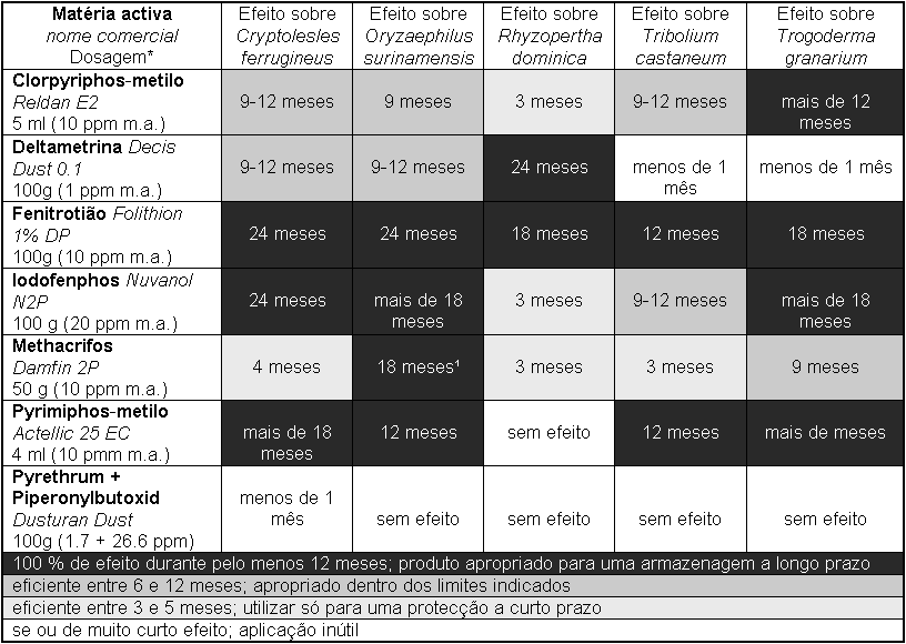 Observações: A permetrina é efectiva contra muitas espécies de pragas que atacam os produtos armazenados, particularmente contra Rhyzopertha dominica e Prostephanus truncatus, embora mostre uma acção reduzida frente às espécies de Tribolium. Ela é muito fiável quando for utilizada em combinação com insecticidas organofosforados, mostrando uma estabilidade prolongada.