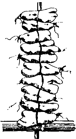 Les tresses verticales sont des structures de stockage bien aérées et faciles à inspecter. Elles permettent de récupérer aisément les semenceaux et de séparer facilement des autres les turbercules pourrissants. Ce système de stockage ne pose aucun problème durant la saison sèche. Pendant la saison des pluies, en revanche, les tubercules pourrissent rapidement en raison de l'humidité atmosphérique élevée (ONWUEME, 1978).