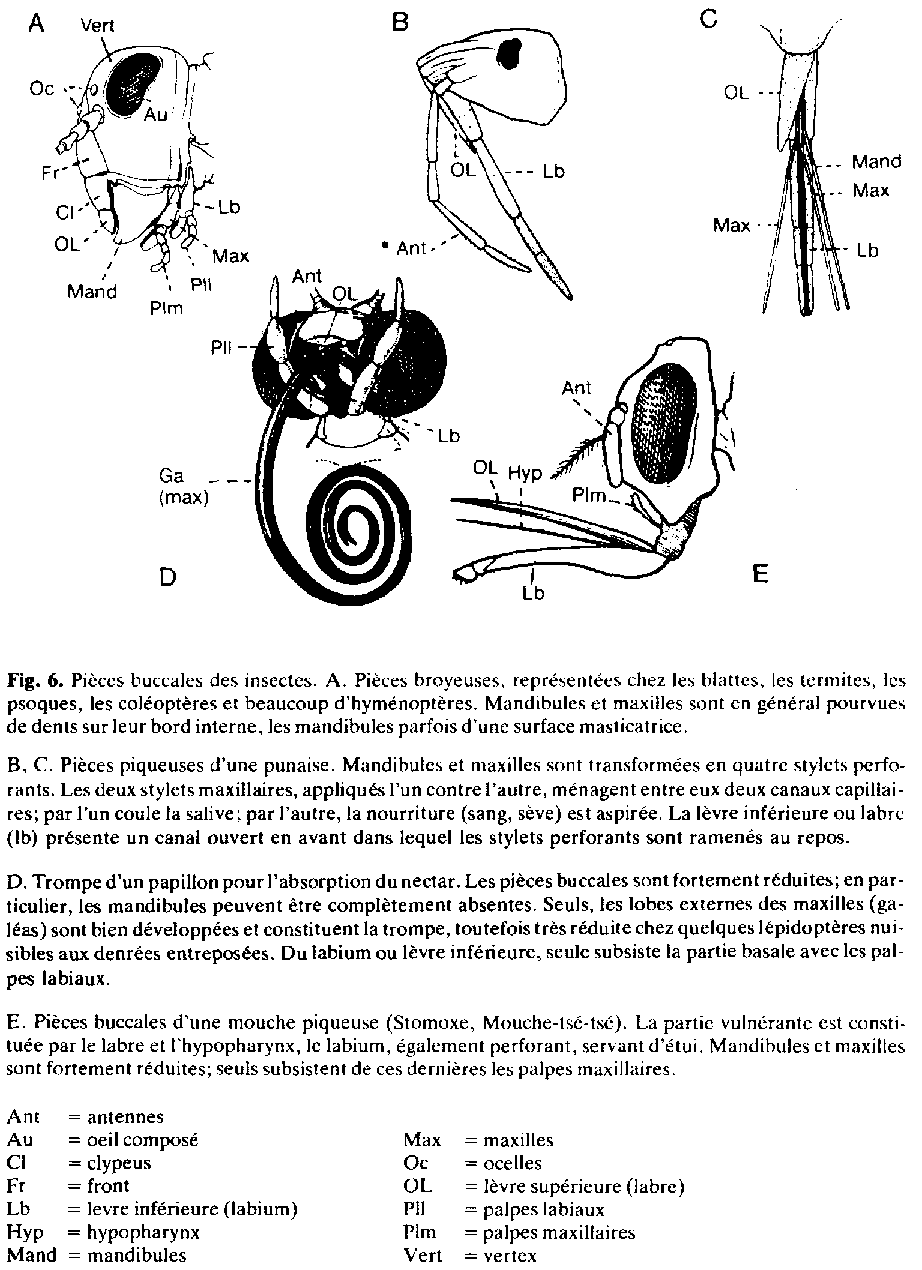 La tête porte les antennes, les yeux et les pièces buccales. Ces dernières sont caractérisées dans le type broyeur par une paire de fortes mandibules (fig.6 A), dans le type piqueur (fig. 6 B. C) ou lécheur par un rostre ou une trompe (punaises, moustiques, papillons, mouches), (fig. 6 D, E).