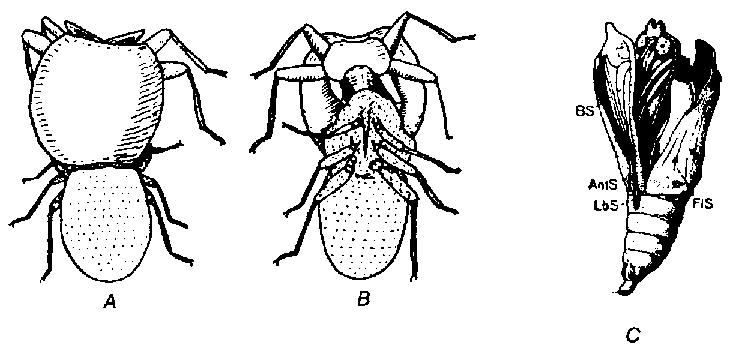 A, B. une punaise des lits en état de mue, en vue dorsale et ventrale. L'ancienne peau larvaire (exuvie) re jetée est ponctuée. C, chrysalide en voie d'éclatement pour libérer le papillon. AntS, BS, FIS, LbS = étuis des antennes, des pattes, des ailes et de la trompe (A, B. d'après HASE; C, d'après PFURTSCHELLER de WEBER).