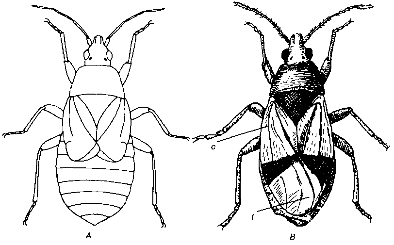 8. Pièces buccales transformées en un rostre (fig. 6 B. C, Lb). Ailes antérieures - lorsque complètement développées - cornées et opaques à leur base (corie), membraneuses et transparentes dans leur partie terminale (membrane). Sur l'insecte au repos, les deux membranes superposées forment un losange (fig. 11 B. 1). Lorsque les ailes sont raccourcies, elles sont entièrement cornées.......... Punaises, Heteroptera