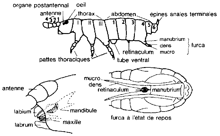 Chez les premiers, la tète est dirigée horizontalement vers l'avant, chez les seconds perpendiculaire ment vers le bas. Les pièces buccales sont articulées dans la capsule céphalique (endognathe), non en dehors comme chez presque tous les autres insectes. Les antennes sont de 4 ou 6 articles. Les trois segments thoraciques portent chacun une paire de pattes ambulatoires (fig. 14.1-111). Les segments abdominaux sont au nombre de 6, nombre atteint seulement à la fin du développement postembryonnaire. Chez les Symphyleona, ils sont peu distincts et soudés aux segments thoraciques.