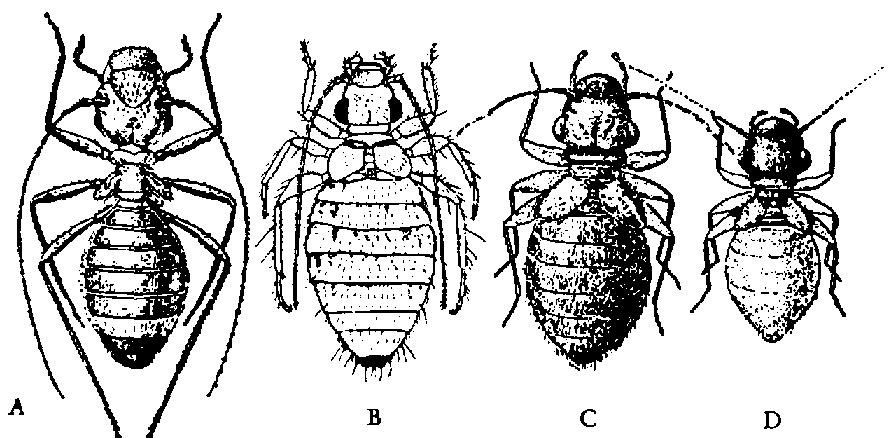 15. Corps comprimé latéralement avec pattes sauteuses. Antennes terminées en massue et logées dans 2 fossettes ménagées de chaque côté de la tête.........................................Puces, Siphonaptera (v. aussi sous 12)