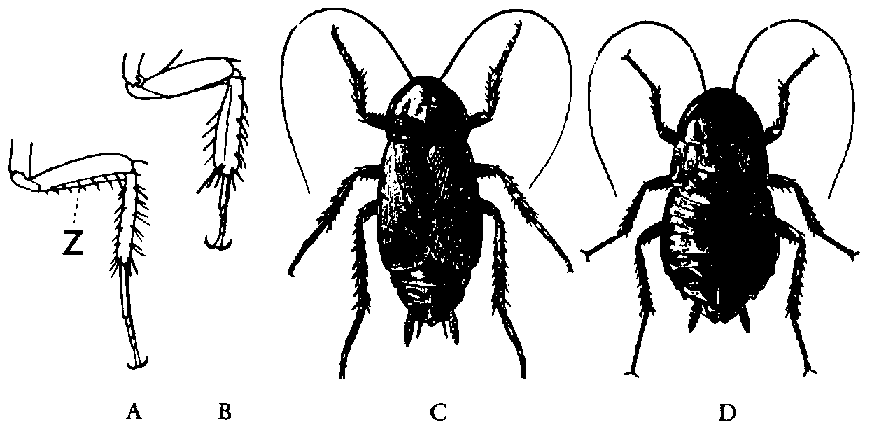 2. Coloration uniforme, brun foncé à presque noire. sans dessins clairs. Mâle avec ailes antérieures (élytres) ne recouvrant pas l'extrémité de l'abdomen (fig. 19 C); femelle avec courts moignons d ailes (fig. 19 D). Longueur 20 à 30 mm ................................... Blatte orientale, Blatta orientalis LINNÉ 1758