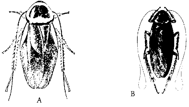 - Pièces buccales broyeuses (fig. 6 A). Ailes antérieures parcheminées. Corps aplati....... Blattes, Blattariae (v. table 3)