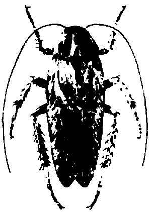 - Pronotum brun brillant; mâle et femelle, de 16-21 mm de long, avec élytres brun-roux et une bande jaune au bord antérieur du pronotum. Larve en forme de goutte (fig. 24 C). Thorax et les 3 premiers segments abdominaux brillants, les autres segments mats, brun-roux foncé unicolores................................................................................Blatte de Surinam, Pycnoscelis surinamensis (LINNÉ. 1758)