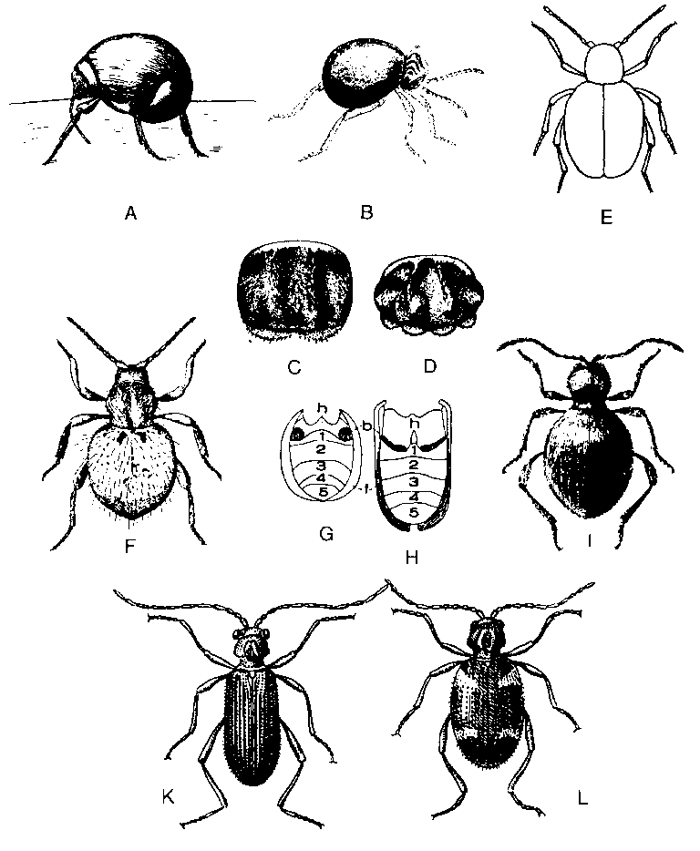 - Sternite du métathorax (h) aussi long ou plus long que celui du 2e segment abdominal (fig. 60H). Intervalle entre la base des antennes plus court que le 1/4 de la longueur du premier article antennaire. Elytres avec de fortes stries ponctuées, généralement allongés avec bords latéraux subparallèles et épaules saillantes chez le mâle (fig. 60K); plus courts, ovoïdes, avec épaules arrondies chez la femelle (fig. 60 L). De coloration noire ou brune jamais dorée- avec des bandes ou des taches pubescentes claires...................... Ptines (sens strict), Ptinus LINNÉ,1776