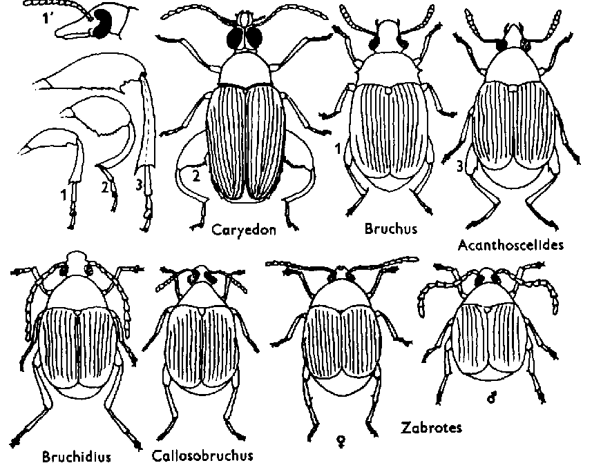 Fig. 67. Bruchidae: Croquis des genres et de leurs caractères distinctifs.