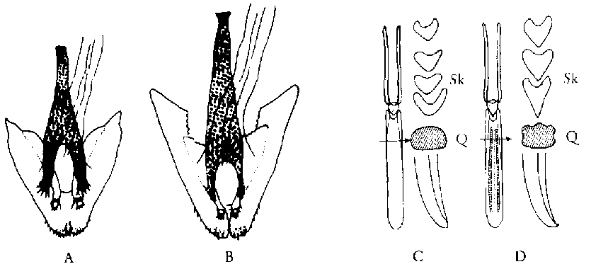 - Longueur du corps, rostre non compris, supérieure à 3 mm; largeur maximale du pronotum supérieure à I mm. Pronotum à ponctuations arrondies sans zone médiane non ponctuée. Le nombre des points dans les deux lignes médianes, du bord antérieur au bord postérieur, est supérieur à 20 (Pl. C' fig. c). Elytres bruns et brillants, avec taches rouges généralement bien délimitées. Des caractères distinctifs plus sûrs sont constitués chez le mâle par le côté supérieur sillonné de l'édéage, par son extrémité en forme de crochet (fig. 71 D) et par l'extrémité pointue du sclérite cordiforme qui est allongée; chez la femelle, par l'extrémité antérieure du 8e sternite en forme d'Y qui est munie latéralement de deux pointes acérées (fig. 71 B)......................................................Charançon du maïs, Sitophilus zeamais MOTSCHULSKY, 1855 )