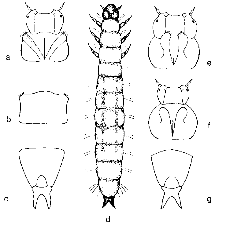 - Les plaques dorsales des segments abdominaux 3-8 ne sont pas interrompues en leur mi lieu par une tache claire. Le bord postérieur des plaques dorsales des segments abdominaux 2-7 ne portent qu'une soie de chaque côté (fig. 77 d, e)
