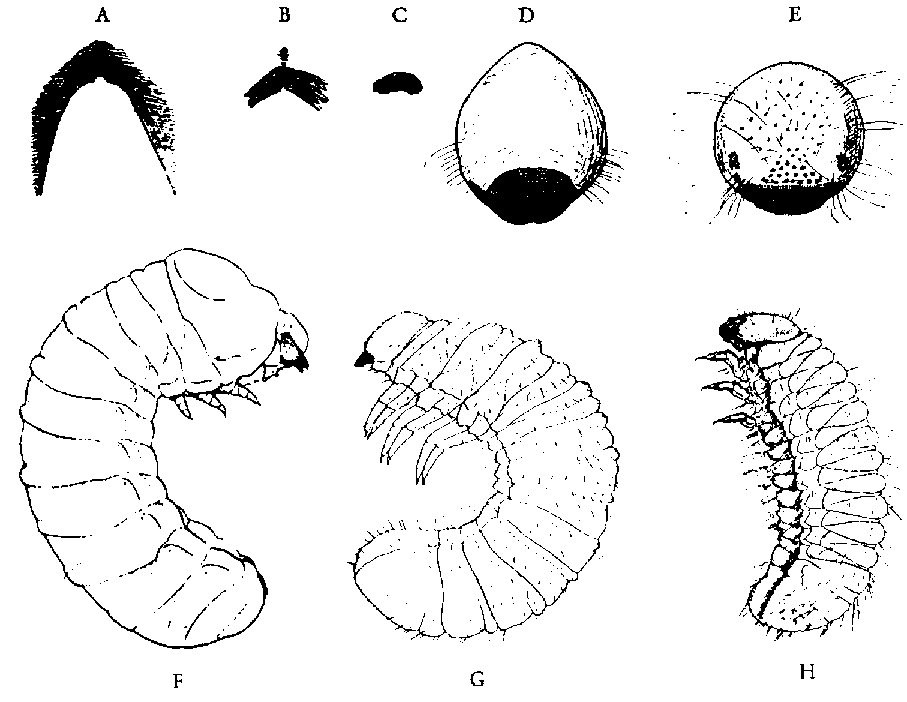 - Les segments du corps portent chacun sur les côtés de leur face ventrale 2 soies; leur face dorsale est peu sclérotinisés et les segments abdominaux à peine bicolores. Epine terminale généralement plus courte que les quelques épines environnantes (fig. 83 au dessus de A, D). Larves jusqu'à 12 mm de long............................................. Petit ténébrion mat, Alphitobius laevigatus (FABRICIUS, 1781)