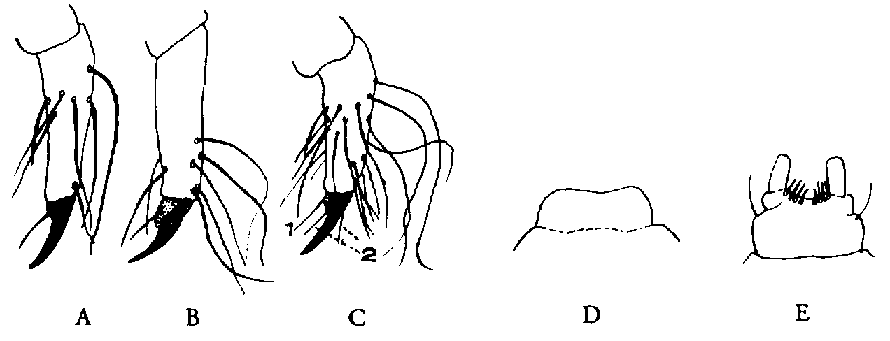 4. Les épines terminales sont très grandes, à peine plus courtes que le reste du dernier segment abdominal. Leur base correspond à environ 1/3 de la plus grande largeur du segment (fig. 81 C)