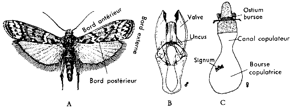 Fig. 91. Aphomia gularis: A, mâle; B. femelle; C, Pyralis farinalis (A, B. de LIEBERS; C, de WEBER).