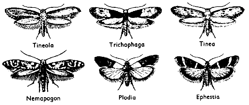 Les papillons dont les chenilles détériorent les denrées se rattachent au groupe des Microlépidoptères. Les dessins de leurs ailes, formés par des écailles diversement colorées, n'étant facilement reconnaissables que sur des individus fraîchement éclos, l'identification la plus sûre des espèces est basée sur l'examen de la nervation alaire et celui des organes copulateurs (génitalia).