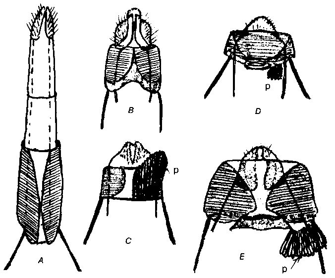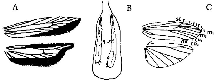 14. Chez le mâle, à la basé de l'aile antérieure, un pinceau de poils est caché sous le repli costal; chez la femelle, l'ovipositeur est court, peu extensible. 8e segment abdominal plus large que long (fig. 94 B-E)