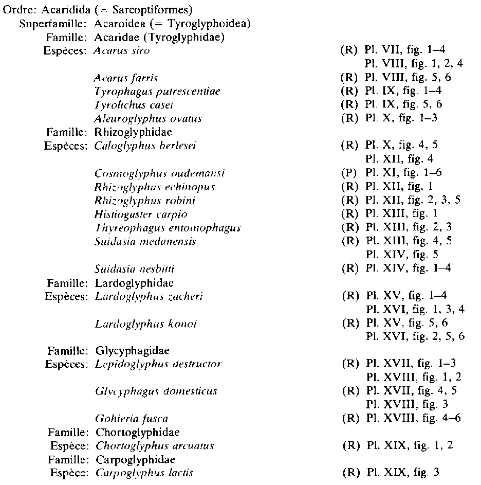 Liste systématique des plus importantes espèces d'acariens apparaissant dans les denrées entreposées