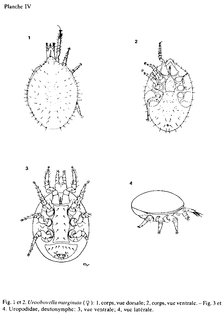 Adultes. Femelle: Les plus importants caractères morphologiques des femelles sont: la grande ouverture génitale qui se trouve entre les coxae III et IV, les quatre paires de soies adanales et les deux paires postanales, la présence d'un orifice ou d'un tube copulateur à l'extrémité postérieure du corps.