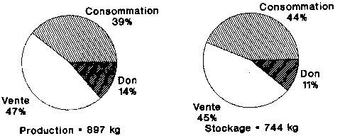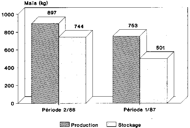 Par la méthode de détermination des quantités de production orientée sur les besoins, on arrive à un besoin semestriel en mais de 306 kg pour la couverture des dépenses irrégulières. Ces dépenses sont en général effectuées directement après la récolte, avant l'emmagasinage du maïs Pour pouvoir faire face aux deux tiers de ces dépenses, le chef d'exploitation doit, pour un prix moyen du maïs de 75 FCFA/kg, vendre un quart de la production. Au cours des deux périodes d'enquête, 75 % en moyenne de la quantité de production ont été mis en stocks. Ce taux est identique à celui établi à partir des besoins.
