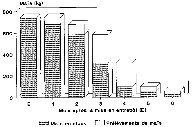 Les résultats des essais ont montré qu'il y avait eu des prélèvements de maïs continuels dans l'entrepôt (figures 5.7 et 5.8). A l'issue d'une période de stockage de trois mois, plus de la moitié de la quantité emmagasinée avait déjà été prélevée. Environ 5 % seulement de la quantité emmagasinée sont demeurés plus de 6 mois dans l'entrepôt.