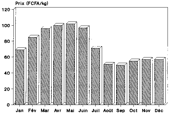 Le prix du maïs est fonction de l'offre. Il est soumis à de fortes variations régionales, saisonnières et annuelles. Les prix peuvent varier de plus de cent pour cent au cours d'une même année (figure 5.11). C'est en août, à la fin de la grande période de végétation, qu'ils sont les plus bas, avec en moyenne 50 FCFA/kg. Ils augmentent lentement durant la petite période de végétation, et ce n'est qu'après la récolte qui clôt cette petite période de végétation (décembre) qu'ils augmentent de manière plus sensible. Les prix sont à leur plus haut niveau entre mars et juin, passant à plus de 100 FCFA/kg au cours des mois d'avril et de mai. Les fluctuations de prix saisonnières reviennent chaque année et touchent toutes les régions.