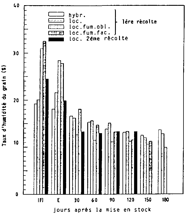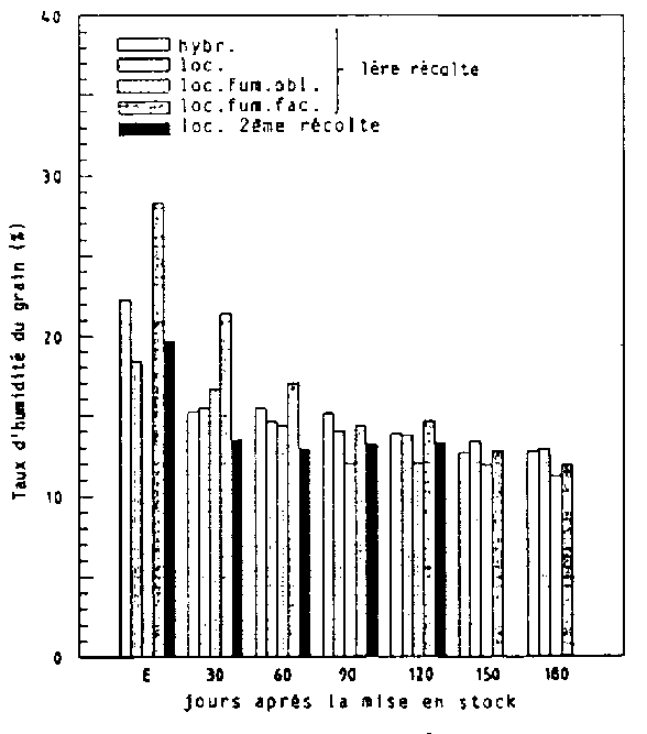 Après sa mise en magasin, le mais non traité a rapidement atteint dans les greniers des régions de savanes son taux d'humidité d'équilibre de 17 à 18 S. pour une humidité relative de 90 % et une température de 25 à 30°C.