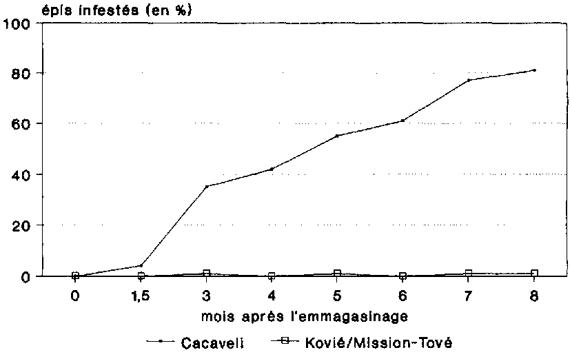 L'infestation des épis de maïs par des lépidoptères sur les sites de Cacaveli, Davié et Kovié/Mission-Tové atteignait en moyenne de 40 à 60 % (fig. 1 et 2). Les valeurs élevées enregistrées à Cacaveli à la fin de la saison de stockage sont vraisemblablement dues à un problème d'identification. En cas de très forte infestation par P. truncatus, il devient en effet difficile d'établir un bilan précis des dégâts dus aux lépidoptères. Sur le site d'Avéta, l'infestation de lépidoptères était beaucoup moins élevée, puisqu'elle n'atteignait ici que 20 à 25 % environ.
