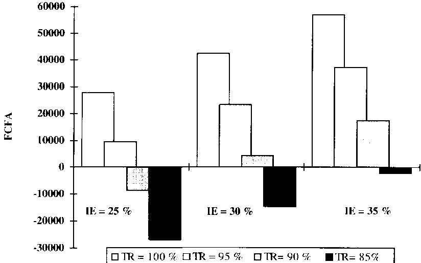 Fig. 19: Budget annuel des recettes et dépenses pour des intérêts sur emprunt (IE) et des taux de restitution (TR) variables:
