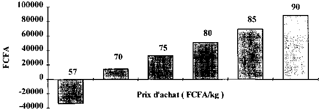 Le prix d'achat moyen des arachides en coques (novembre) au cours de la période 1986-1990 s'établissait à 81,76 FCFA/kg. La fourchette entre le prix d'achat et le prix de vente (vente en août) était en moyenne de 54,4 % au cours de la même période.
