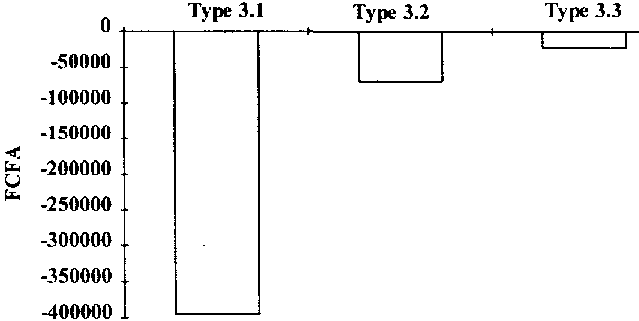 Les types 2 et 3 correspondent aux entrepôts décrits pour le Burkina Faso. La seule différence réside dans la capacité (type 2 = 10 t, type 3 = 20 t). Les amortissements n'ont pas été pris en compte dans la mesure où, premièrement ils ne représentent pas des dépenses réelles, et deuxièmement parce que l'on postule que le magasin est suffisamment bien entretenu pour qu'il ne soit pas nécessaire de le démolir ni de le reconstruire, ce qui explique que l'on ait estimé les coûts d'entretien à un niveau élevé de 5 % des frais de construction. Les deux types présupposent l'octroi de crédits à court terme. On a examiné pour chacun d'entre eux trois variantes en ce qui concerne le financement du magasin et celui du crédit à court terme: