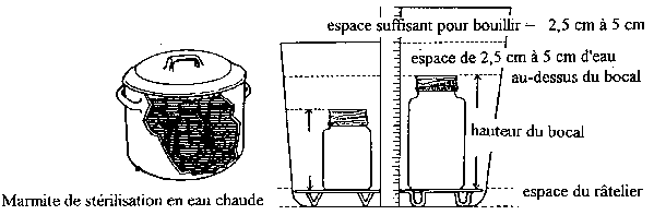 On emploie couramment deux types d'appareils pour la mise en conserve des produits horticoles. Le premier fait appel à un bain d'eau chaude, dans une grande marmite avec un couvercle séparé et un râtelier pour éviter que les bocaux ne reposent sur le fond. La marmite doit être assez grande pour que les bocaux soient recouverts par 2,5 cm à 5 cm d'eau et qu'il reste encore 2 ou 3 cm supplémentaires pour permettre à l'eau de bouillir. Le diamètre de la marmite ne dépassera pas de plus de 10 cm le diamètre du brûleur de la cuisinière pour assurer un chauffage uniforme.