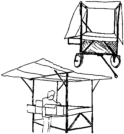 Una ayuda sencilla para los empacadores de campo es este carro móvil con una rejilla que sirve de base para las cajas y un techo que proporciona sombra. El carro está diseñado para ser empujado a lo largo de la orilla de los campos de cultivo que se están cosechando y que no son de gran tamaño.